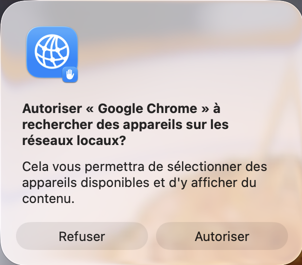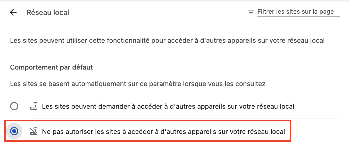 Entrez cette adresse dans Chrome : chrome://settings/content/localNetwork