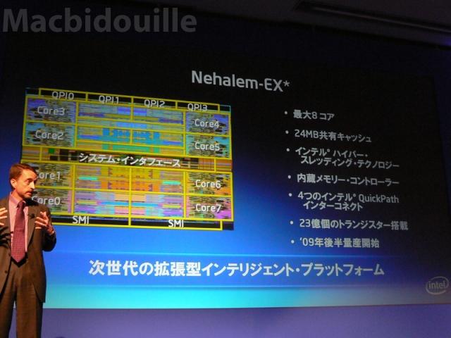Le site Japonais PC Watch a assisté à une présentation d'Intel au sujet des Nehalem. Outres les informations que nous connaissons déjà sur les produits actuellement commercialisés et que l'on trouve dans les Mac Pro, ils ont dévoilé d'intéressantes informations sur le futur relativement proche.