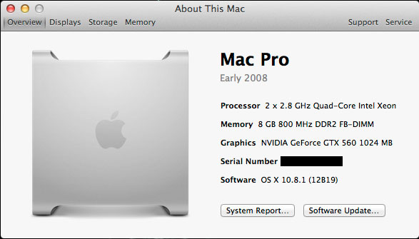 Ceci illustre bien ce que nous vous disions, à part l'écran de démarrage qui ne s'affiche pas, la carte ne fonctionnant qu'une fois les extensions chargées, une Geforce GTX PC tourne comme un charme dans un de ces Mac Pro, tout du moins à partir des modèles 2008 à l'EFI 64 bits et sous la 10.8.1.