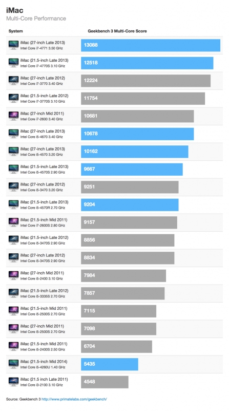 Lorsque l'on utilise un seul cœur, et durant les tests relativements courts de GeekBench, la machine fait illusion et fait presque aussi bien qu'un iMac 4 cœurs à 2,7 GHz de 2013. C'est lié à son puissant mode Turbo qui permet à ce cœur d'atteindre les 2,7 GHz, ce qu'il ne fera qu'avant d'atteindre ses limites thermiques qui seront, souhaitons-le, longues à atteindre avec un refroidissement très large dans une grosse machine.