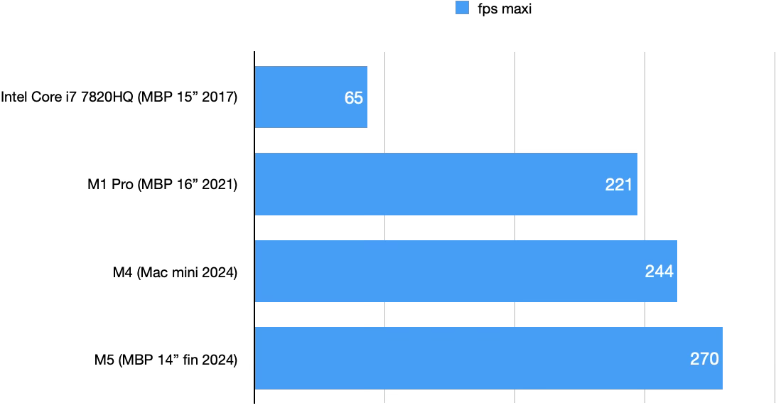 Et voilà les résultats "avg fps" (fps moyens lus à la fin, en bas à gauche) avec les Mac que j'ai sous la main :