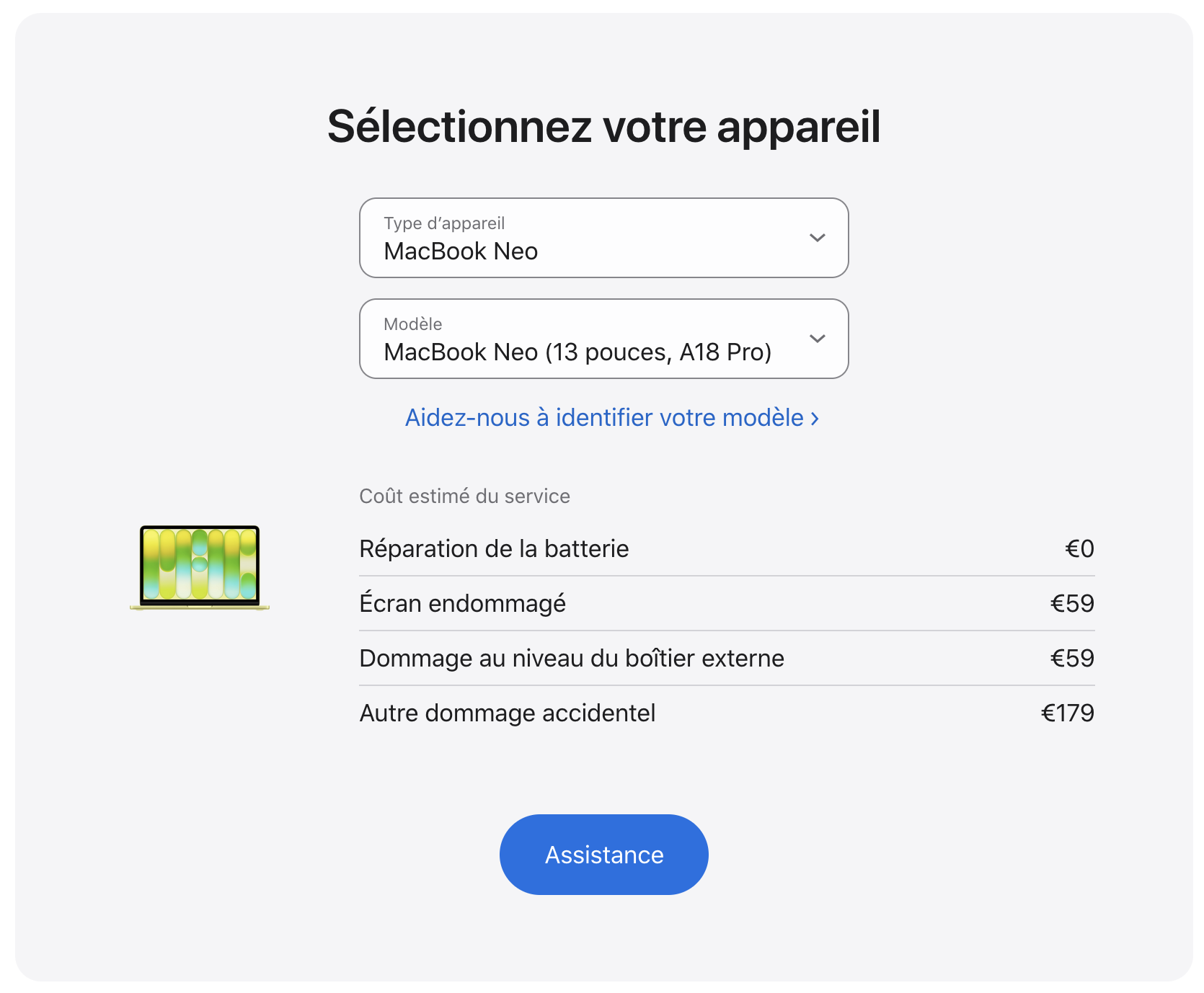 Une structure interne plus simple et plus modulaire permet logiquement de réduire le temps de réparation et donc les coûts associés. On commence ainsi à avoir quelques indications sur les prix de réparation du MacBook Neo chez Apple. Hors garantie, le remplacement de la batterie est annoncé à 169 €, les autres réparations nécessitant pour l’instant un devis après inspection de la machine. Avec AppleCare+, il faut compter 59 € pour un écran ou un dommage au boîtier, et 179 € pour d’autres dommages accidentels, tandis que le remplacement de la batterie est gratuit si sa capacité descend sous 80 % de sa capacité d’origine.