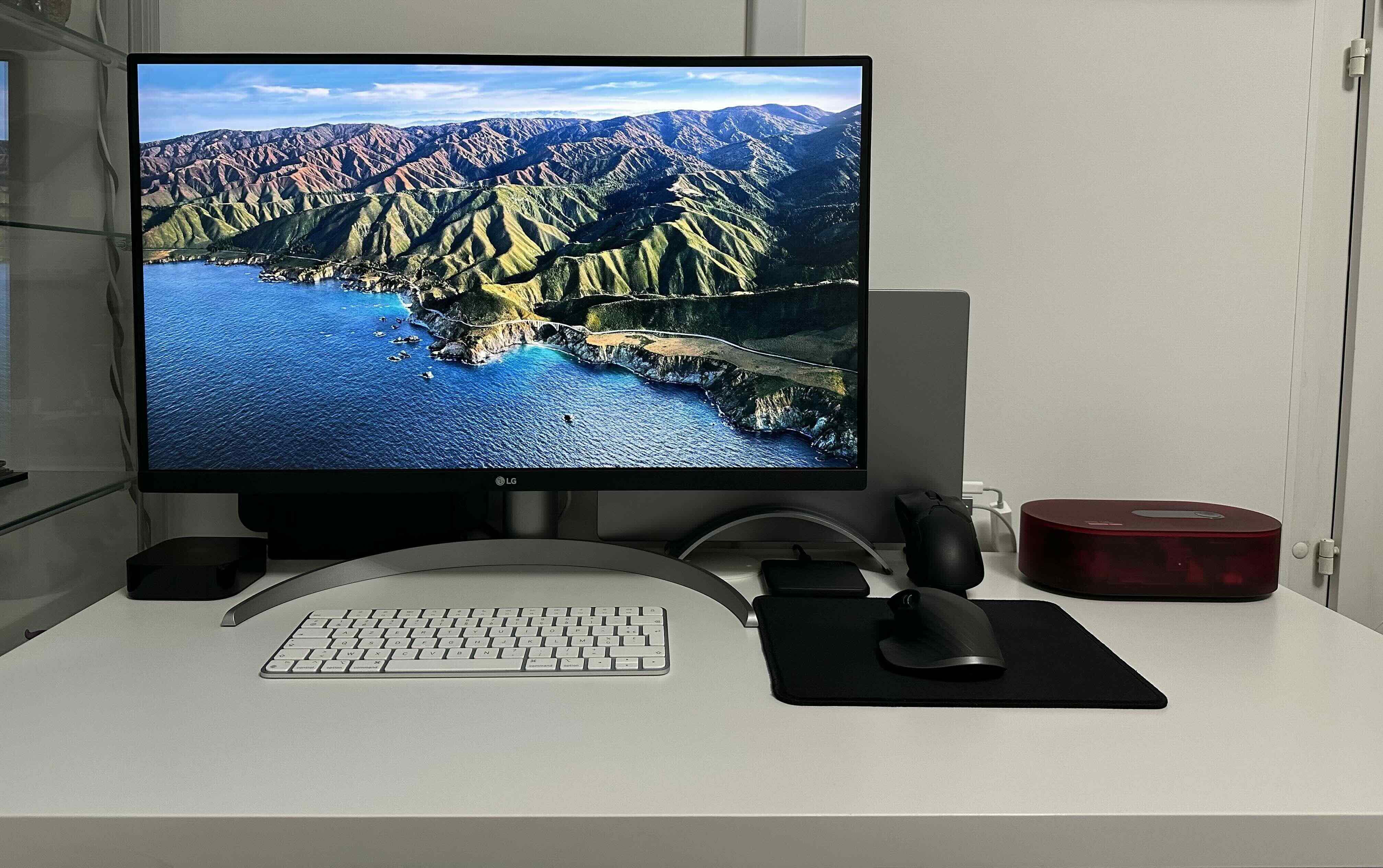 Mon bureau reste volontairement assez épuré. L’écran est placé au centre, avec le clavier et la souris juste devant, et très peu d’éléments autour. Le Mac est positionné derrière l’écran et utilisé la plupart du temps en mode clamshell, ce qui permet de conserver un espace de travail propre et dégagé.